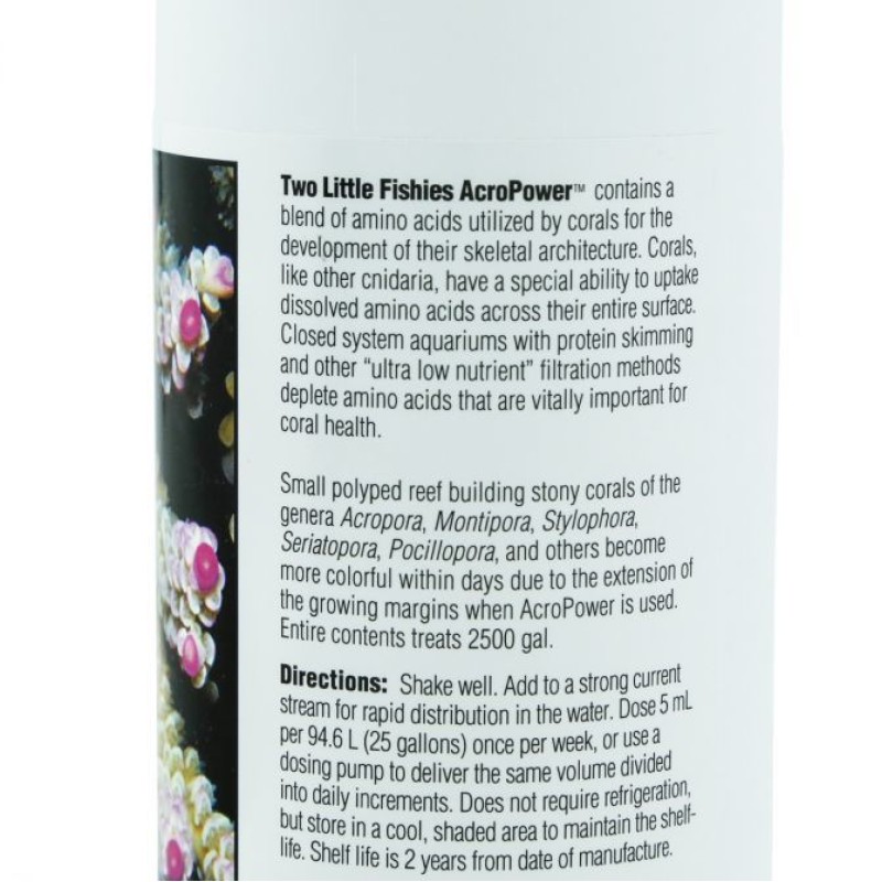 Folositi AcroPower de la Two Little Fishies pentru a furniza aminoacizi coralilor. Aminoacizii se pot epuiza cu usurinta in sistemele de acvariu de recif prin skimmere ​​si in sisteme de nutrienti foarte scazute. Formulat speciala pentru corali SPS.