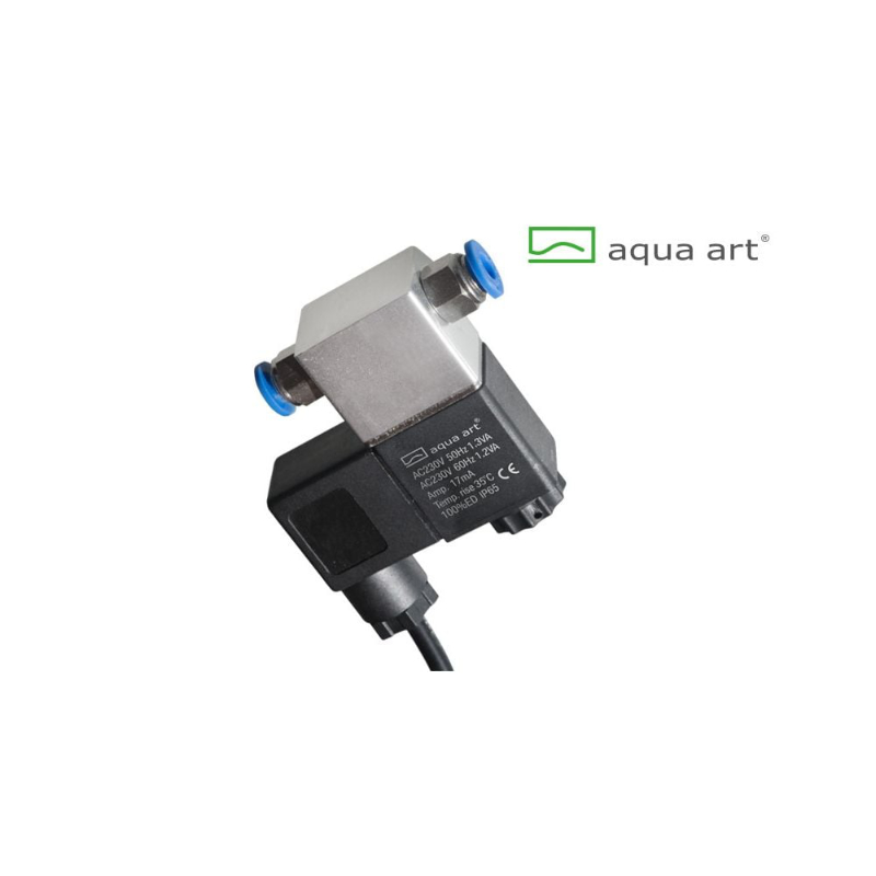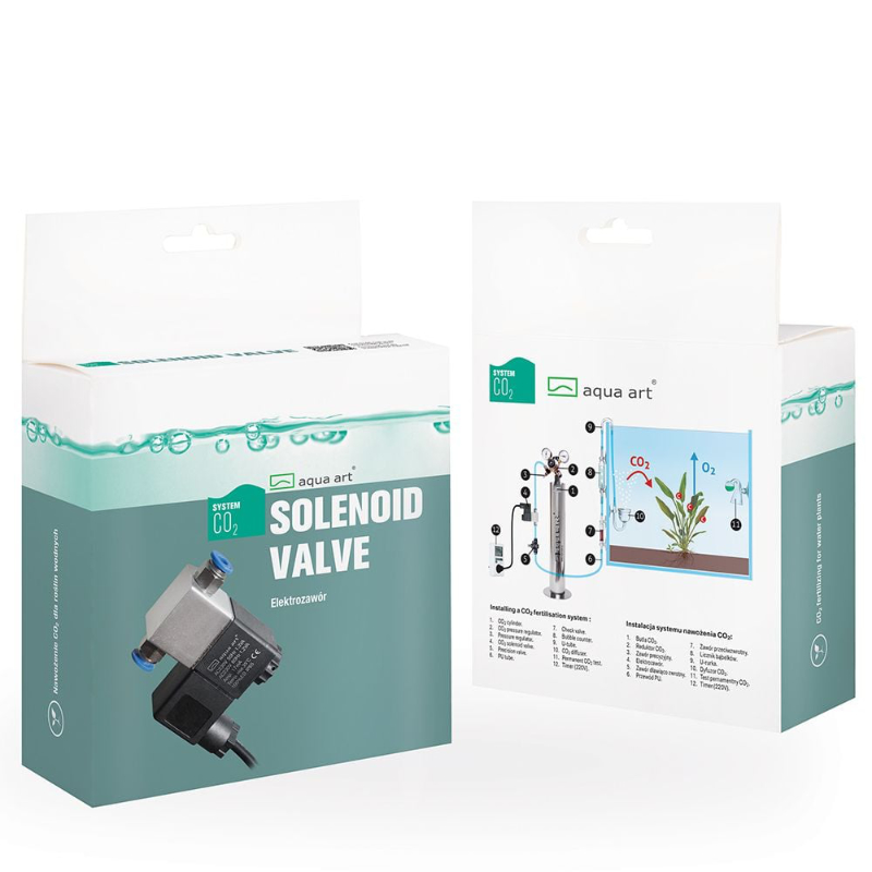 Supapă electromagnetică pentru dioxid de carbon (CO2). Reglează doza de CO2 în acvariu. Conectat la un cronometru, permite pornirea dozării CO2 în timpul zilei (acvariu luminat) și oprită noaptea (întunericul în acvariu). De asemenea, poate funcționa cu un computer de control al pH-ului, reglând și menținând un nivel constant de CO2 în apă. Când CO2 din cilindru este epuizat, acesta împiedică reductorul și cilindrul să fie inundate cu apă.