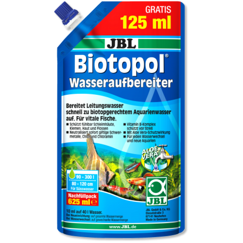 Cum actioneaza  JBL Biotopol • Transforma rapid apa de robinet intr-o apa adecvata acvariilor de apa dulce.• Neutralizeaza imediat metalele grele toxice(cupru,zinc,plumb,etc), clorul  si cloramina. • Aloe Vera asigura protectie impotriva stresului, protejeaza semnificativ mucoasele  pestilor si reduce riscul de imbolnavire cu complexul sau de vitamina B.• Chelatorii din Biotopol neutralizeaza  metalele  grele si substantele  agresive, care vor fi  eliminate in timpul urmatorului  schimb partial de apa.