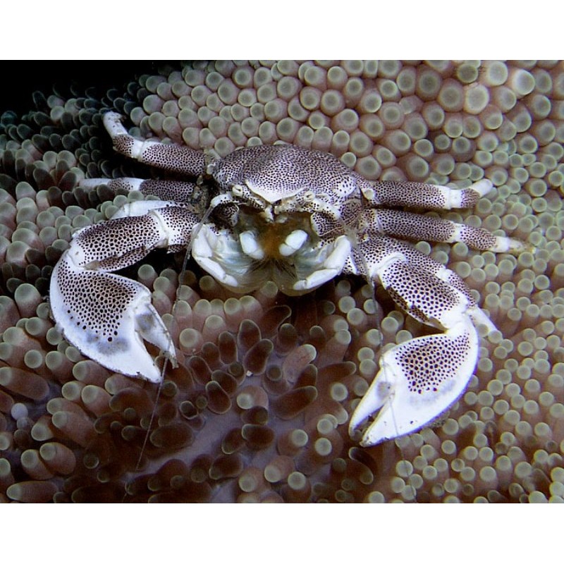 Neopetrolisthes OshimaiCrabul de porțelan sau de anemona este un crab de talie mică cu un aspect aparte. Au un corp aproape alb, cu diverse marcaje roșii și pete negre.Acești crabi ating o dimensiune maximă la maturitate de aproximativ 1 cm și trebuie să fie ținuți în acvarii cu dimensiunea de cel puțin 50 de litri.