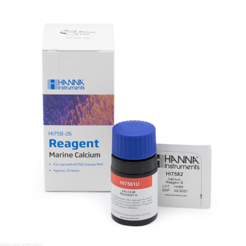 HI758-26 sunt reactivi de înaltă calitate care sunt pre-măsurați, permițând utilizatorilor să obțină măsurători rapide și exacte cu minicolorimetrul de calciu marin ®HC. Acești reactivi respectă metoda Zincon în care reacția provoacă o nuanță albastră în probă. Prin adăugarea simplă a 1 ml din primul reactiv la probă, urmată de un pachet cu al doilea reactiv din setul HI758-26, reacția va avea loc și HI758 va determina concentrația din culoarea care este produsă. Rezultatele vor fi afișate în ppm de calciu. Acești reactivi sunt concepuți pentru a fi utilizați cu probe care au un interval de la 200 până la 600 ppm calciu.